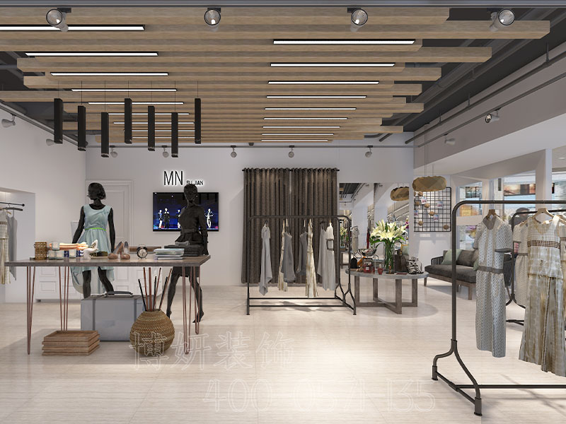 本案例为女装店装修案例,本案例店铺因地制宜采用了开放式设计,技能合理利用空间又能给顾客以全方位展示,一举两得,在一侧的入口处设置以个性的橱窗,内部并没有选择花哨的颜色,个性的衣架分布于浏览区,顶部设置以个性的造型配合以个性射灯,整个空间清新、典雅、庄重。